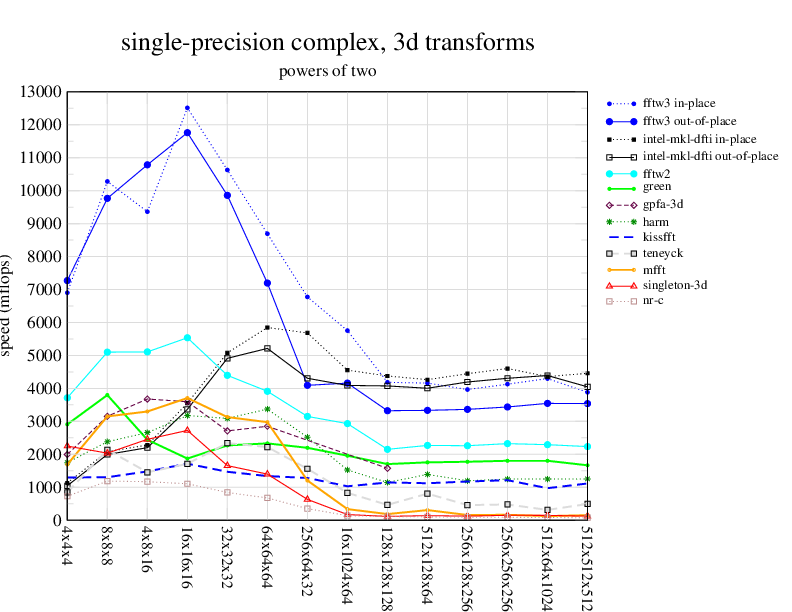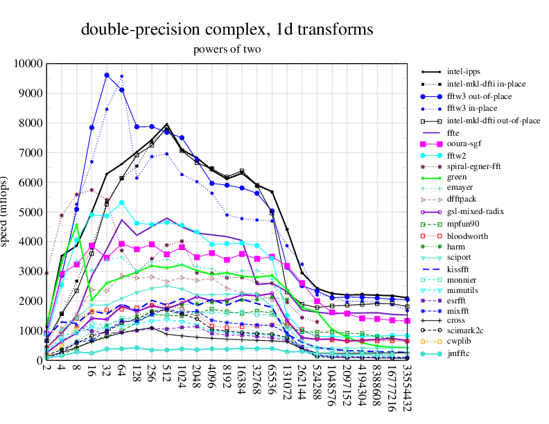NOTE: Because this benchmark includes very large transforms, we noticed a bug in FFTW 3.1.2 that causes it to pick suboptimal algorithms for transforms that take more than a couple of seconds. We therefore benchmarked a version of FFTW patched to fix this bug; the patch will be included in the next release, but for now you can just edit kernel/timer.c to replace 1.0E10 with 1.0E100. Sorry about that.